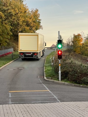 Die Ampelanlage für den Werksverkehr in Freyburg ist in Betrieb. Sie trennt auf der schmalen Straße den Werksverkehr (wie bspw. Shuttlefahrten zum Logistikzentrum oder Fremdfirmenfahrzeugen) vom Fußgängerverkehr.