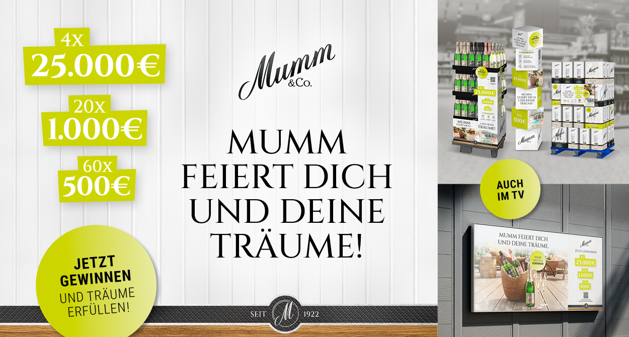 Nach einem erfolgreichen Jahr 2024 mit +13% Absatzsteigerung vs. Vorjahr, will Mumm mit dem bisher größten Gewinnspiel der Markengeschichte für unsere Konsumentinnen und Konsumenten an den Erfolg aus dem vergangenen Jahr anknüpfen und mit einer noch nie dagewesenen POS-Aktivierung beim Shopper und Handel punkten.