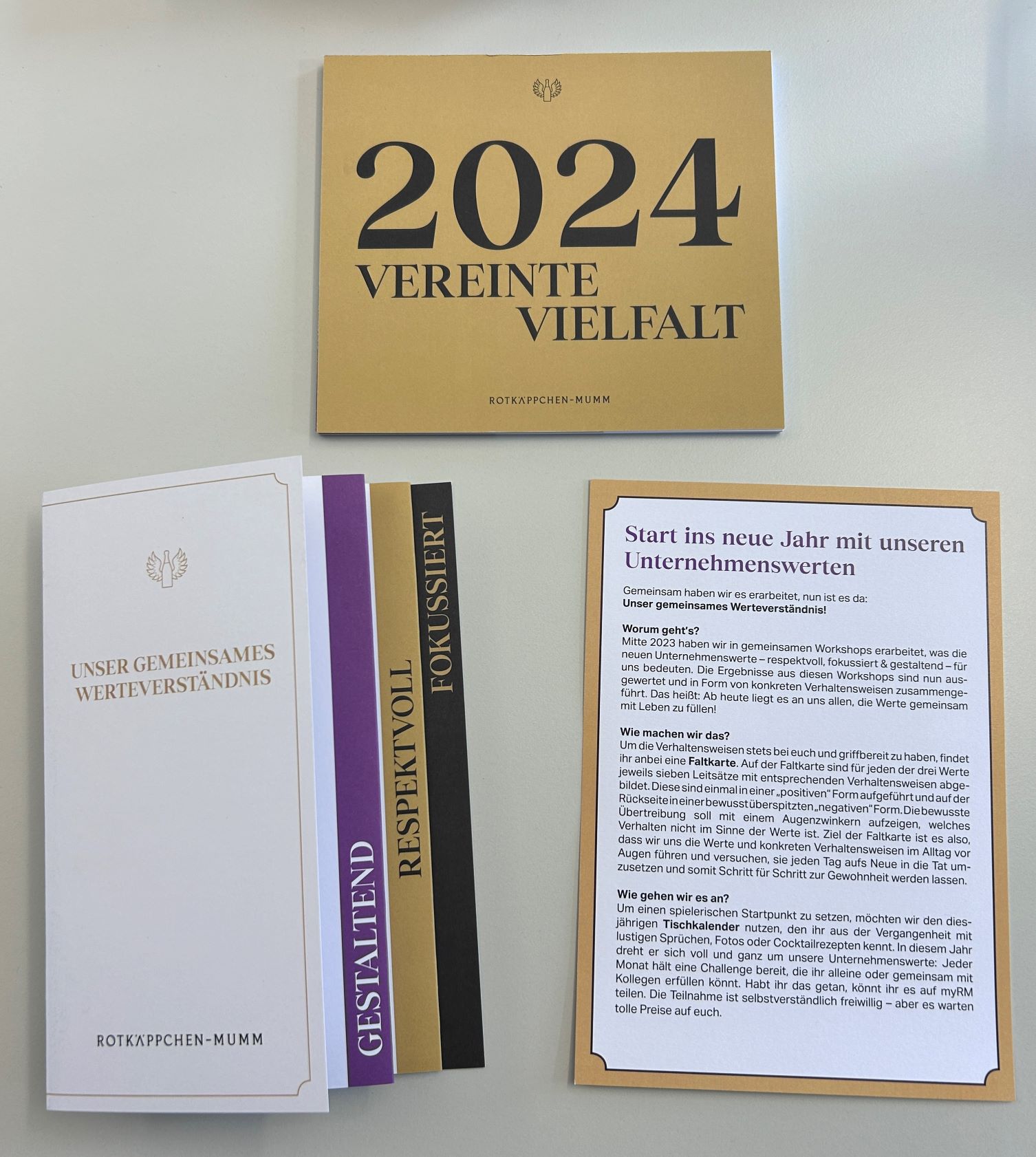 Es geht los: Wir setzen gemeinsam den Startpunkt für die Aktivierung unserer Unternehmenswerte. Dazu werdet ihr alle in den kommenden Tagen ein kleines Set mit Unterlagen an eurem Arbeitsplatz finden.. Dazu gehört auch der RM-Tischkalender 2024. Seid gespannt auf  monatliche Challenges und tolle Gewinne.